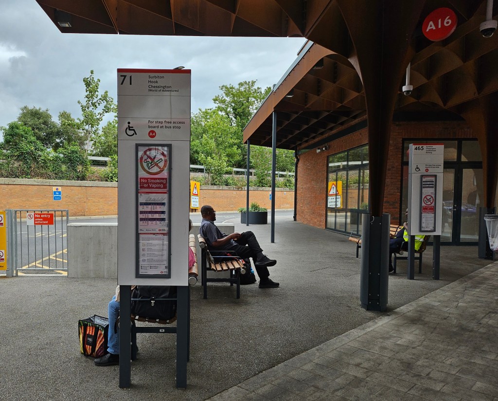 I thought that I would have a ten minute wait for the next Superloop SL7, but to my surprise one turned up within a couple of minutes. The traffic was busy, but there was no major congestion, so the bus steadily gained time against its schedule. Passing alongside Bushey Park, I noticed that recent rain made it look greener than it had when I came this way a month earlier. Crossing over Kingston Bridge brought me south of the River Thames for the first time. As we got closer to Kingston, I began to realise that there was a possibility of catching the 1130 service to Dorking from Kingston bus station, which would put me back on my originally planned schedule. However, at the preceding stop, in Kingston town centre, there was a crowd of people waiting to get on, so that as the bus pulled up alongside Kingston bus station, I could see the 465 to Dorking just pulling out.