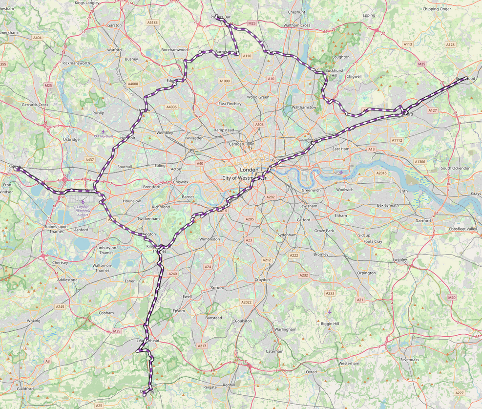 Having circumnavigated London using the Superloop network of buses the previous month, which took just 7¼ hours, I felt like taking on a far more challenging bus odyssey. I was inspired by a Diamond Geezer blogpost, which identified the most northerly, southerly, easterly and westerly bus stops to be served by a Transport for London (TfL) bus. These stops are in Potters Bar, Dorking, Brentwood and Slough respectively, all of which are outside Greater London. My aim was to do a tour of the capital, travelling only on London buses, catching a bus to or from all four of these extreme bus stops, and then returning to my starting point.