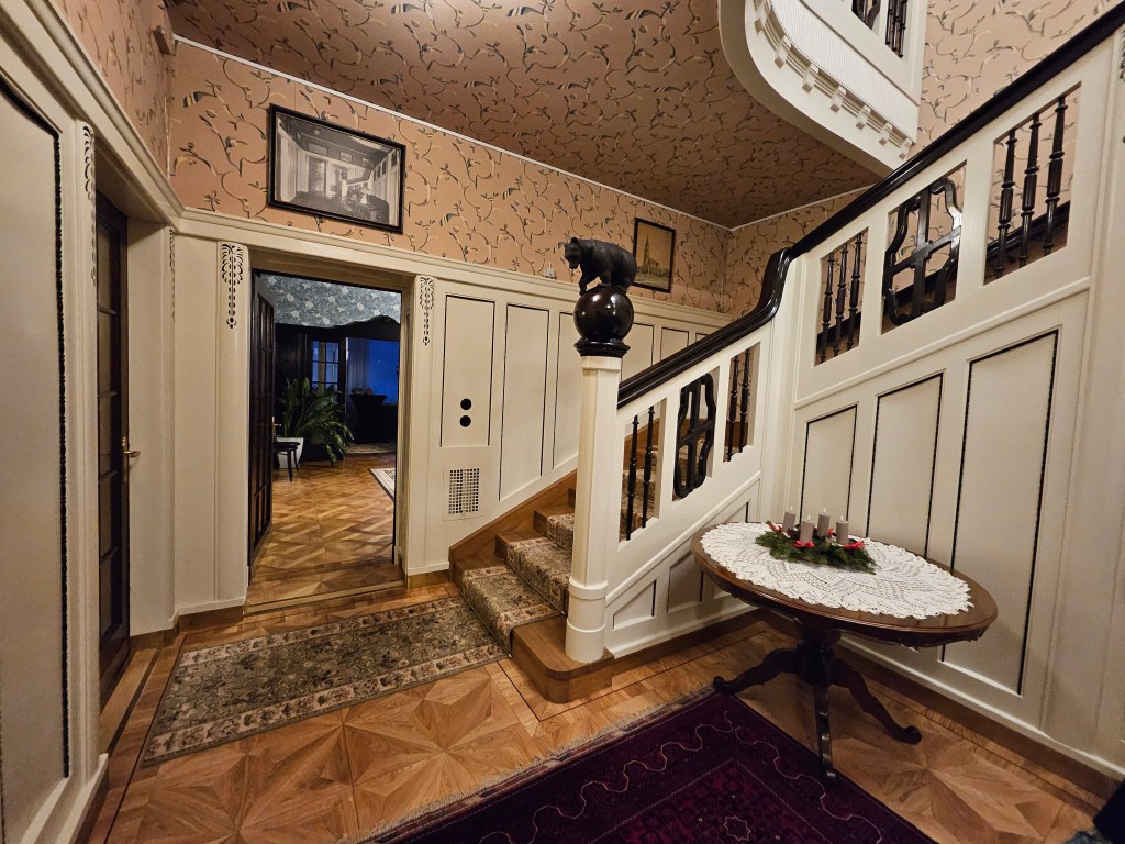 We arrived at the Villa Grossmann just in time for our tour at 4pm. There were four other people on the tour, which was conducted in Czech, but we were given information sheets in English describing each of the the rooms on our tour. The Villa was built between 1922 and 1924 by František Grossmann. a German speaking architect and builder, in a highly decorative style. It was built to be his own private home. Despite being one of the richest families in Ostrava, the Great Depression took its toll on their finances and in 1932 Grossman and his wife committed suicide and the Villa was sold as part of bankruptcy proceedings. Eventually in the 1960s the Villa was acquired by the city council which first used it as school and then as a kindergarten. The building became increasingly dilapidated and the kindergarten closed in 2005. After a restoration to its former glory which took two years, it was opened to visitors in 2024. The tour was informative, taking us from the basement boiler controlling the hot air central heating up to the spartan attic. In between, the main floors of the villa are very ornate and the restoration has been immaculately done.
