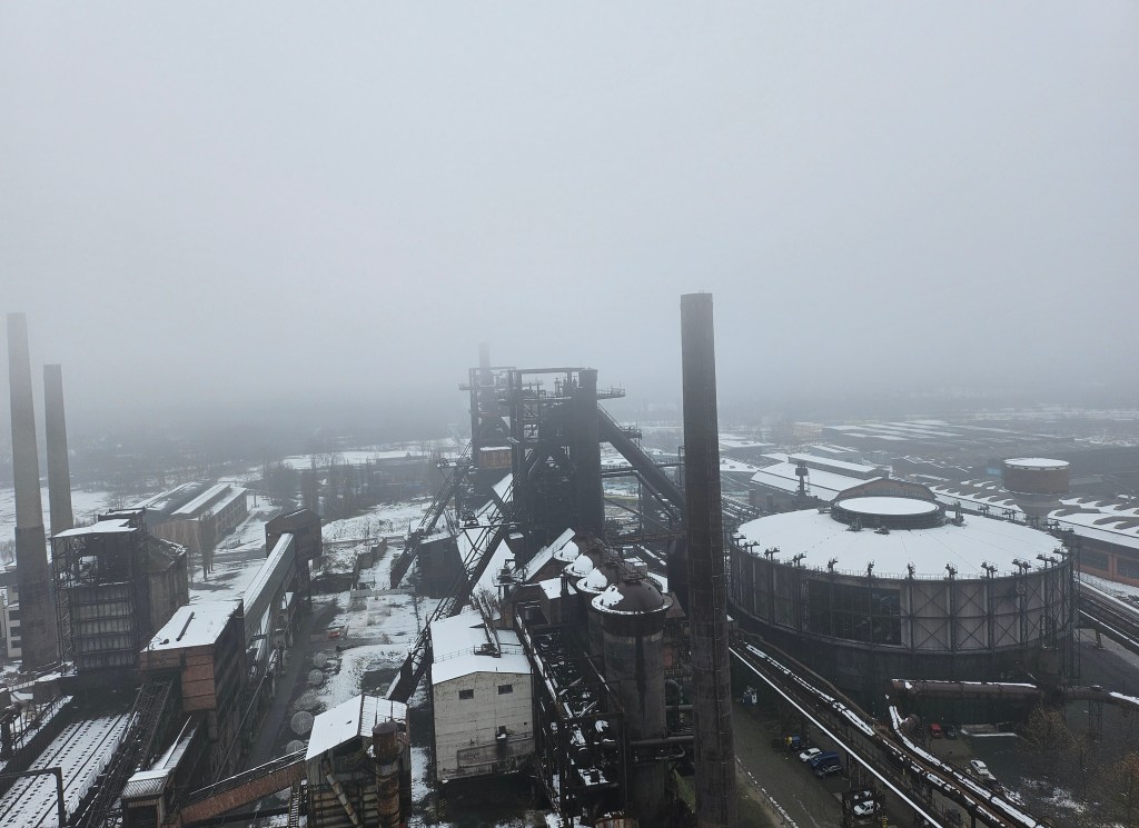 Although it was slightly misty when we awoke, the weather forecast suggested that it was likely to get worse as the day progressed, so we decided to go up the tower of Ostrava New Town Hall, which opened at 9am, an hour before the other attractions in the city. The first challenge was finding the way in. After walking all round the building looking for an entrance to the tower, we concluded that one needed to go through the main doors of the Town Hall. This was indeed the case and within the main foyer of the Town Hall there is a lift which you take to the sixth floor. This brings you to a small information centre and ticket office for the tower. From here you get a different lift to take you to the top of the tower. It was cold at the top and the views were not great – we could barely make out the centre of of Ostrava, a few hundred metres away. We could just see across the Ostravice river, which used to form the boundary between Silesia and Moravia. The far bank is in Silesian Ostrava, which was a separate city until the 20th century, while the current historic centre was in Moravian Ostrava.