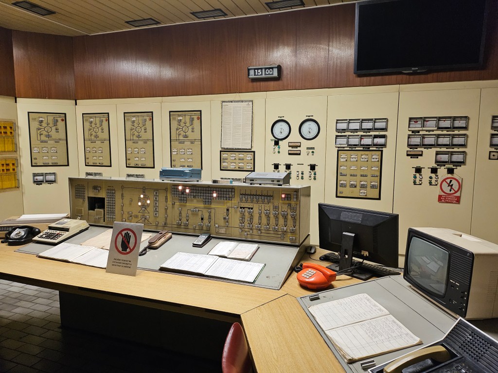 We had booked ourselves onto a tour of the former iron works commencing at 10 am. We were joined by four other participants on the tour and a tour guide who spoke no English, so we were given information sheets explaining about all the places that we would be seeing. Before we could start the entire group had to don hard hats – these were colour coded (ours were green), presumably to distinguish between different groups at busy times when there may be more than one group touring the site. We went via some coking ovens to the Bolt Tower, a large structure which used to house a blast furnace, into which the raw materials were dropped from a great height. We had to climb to the top of Bolt Tower, as the lift was out of order. On our descent we went into the heart of the blast furnace and then to the outside of it to see where the molten pig iron was tapped and the slag siphoned off. The final point of the tour was to visit the control room for the whole site, which contained what was then state of the art electronic equipment when the site closed in 1998. There is still a 1998 calendar on the wall of the control room.